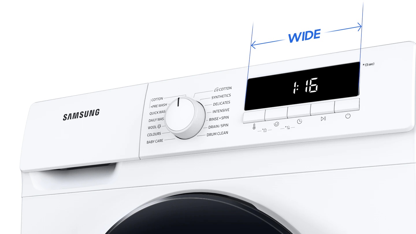 سامسونگ در این ماشین لباسشویی از نمایشگر LED بزرگتر با این قابلیت که راحت تر خوانده می شود، استفاده نموده است. برنامه های لباسشویی به هنگام استفاده به زیبایی روی این نمایشگر نوشته می شوند و در هر لحظه نیز می توان از وضعیت ماشین لباسشویی اطلاع یافت. نمایشگر عریض این ماشین لباسشویی یکی از تفاوتهای این ماشین با سریهای پیشین است. سادگی و زیبایی در نمایش از ویژگی های این نمایشگر می باشد.