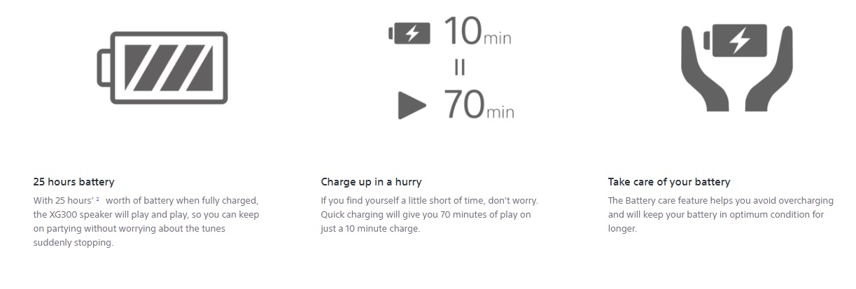 سونی در این مدل اسپیکر جدید خود همانند مدل های مشابه یعنی XG300، XE300 از بلندگو های اکسترا بیس استفاده نموده که حالت صوتی Live Sound دارند. بدین معنا صدایی شبیه سازی شده را به صورت سه بعدی انتشار می دهند و شما را در دل سینما قرار می دهند. همچنین بلندگو های داخلی آن از سیستمهای صوتی حرفه ای الهام گرفته است و پخش کنند هایی به صورت Line-Shape Sony خطی ایجاد می کند که انرژی صدا را به طور یکنواخت تر توزیع می کند و این نیز منجر می شود فضای که داخل آن قرار دارد از صدای طنین انداز پر شود و همه شنیدار آن شوند.
