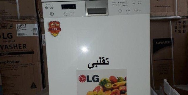 ماشین ظرفشویی ال جی تقلبی در سمت راست-ماشین ظرفشویی شارپ در سمت چپ که با برچسب و لوگوی ال جی مزین شده و به فروش می رسد.