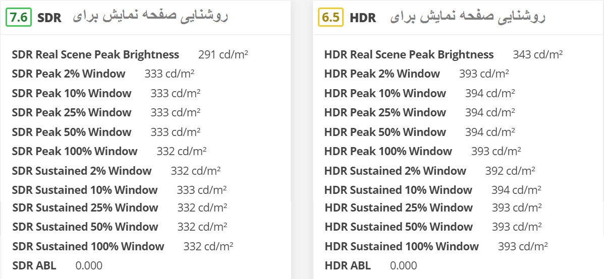 روشنایی صفحه نمایش برای محتوای SDR و HDR برای درصد های مختلف از صفحه نمایش