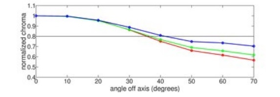 همچنین در نمودار زیر نشان داده شده است که از زاویه 36 درجه به بعد رنگ ها یک دست شده و تمایز و تفاوت آنها کاهش می یابد که نتیجه آن کاهش کیفیت تصویر است: