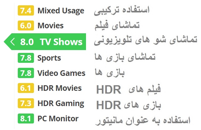 امتیازات در نظر گرفته شده برای کاربری های تلویزیون X8000G (مبنا عدد 10 می باشد)