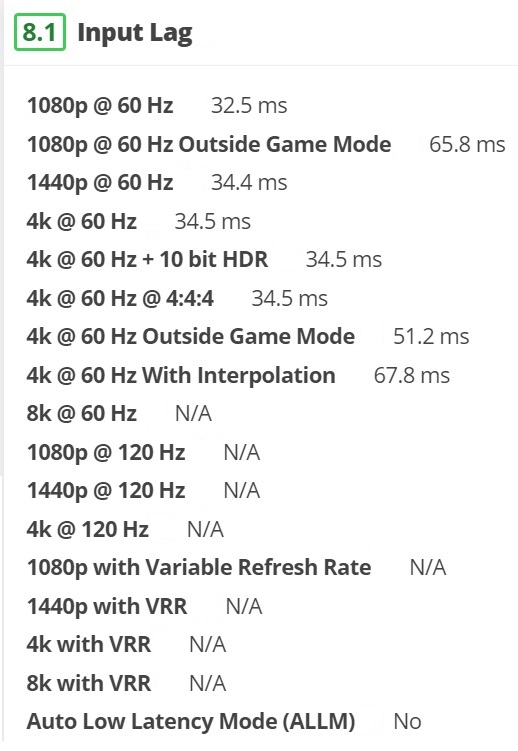 سرعت انتقال داده در یک تلویزیون تاثیر مستقیمی بر کیفیت تصویر و صدا می گذارد. سرعت انتقال داده به ورژن پورت ها و نرخ نوسازی تصویر مربوط می شود. به مدت زمانی که طول می کشد تا یک داده از دستگاه پخش کننده فیلم یا بازی بر روی صفحه نمایش به عنوان تصویر و یا در سیستم صوتی به عنوان صدا پخش شود، زمان تاخیر Input Lag می گویند. در تلویزیون سونی X8000G زمان تاخیر در رده متوسطی قرار دارد. در زیر میزان تاخیر برای انواع رزولوشن و کیفیت های تصویر در تلویزیون X8000G آورده شده است.