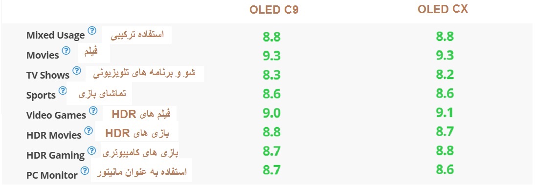 مشاهده می شود که برای هر نوع استفاده که در تصویر بالا آورده شده است این تلویزیون بسیار به هم نزدیک هستند و امتیاز های مشابهی را کسب کرده اند .