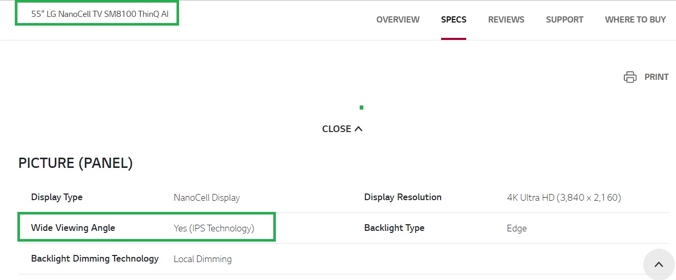 هر تلویزیونی که اصلی باشد و به عبارتی اصالتی داشته باشد باید در وب سایت شرکت سازنده موجود باشد. البته بعضی از محصولات زمانی که در وب سایت سازنده جستجو می شوند عبارت Support & Manual آورده می شود و بدان معنا است که آن محصول تولید شده و دیگر در کارخانه تولید نمیشود. مشخصات تلویزیون در وب سایت شرکت سازنده در قسمت Specs و یا Specification بیان می شود که بسته به برند مثلا ال جی و سامسونگ متفاوت خواهد بود. در وب سایت ال جی در قسمت پایین عکس تلویزیون گزینه های Feature و Specs و… آورده می شود در حالی که در وب سایت سامسونگ در بالای محصول این قسمت ها آورده می شود. در هر دو مورد مشخصات در پایین ترین قسمت صفحه محصول آورده می شود. وقتی به مشخصات مراجعه می شود، هر مشخصه بیانگر یک کاربرد و کارایی در تلویزیون که دانستن انها حائز اهمیت است. در اینجا ما قسمت Wide Viewing Angle را ارائه می دهیم.