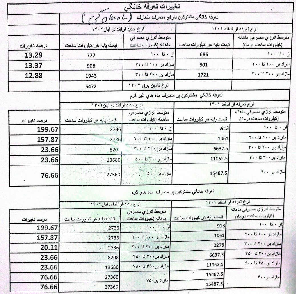 این یک نمونه تعرفه برق مصوب سال 1402 مخصوص استان کردستان (مناطق سردسیر) که قطعا این مبالغ برای استانهای مانند خوزستان متفاوت است.